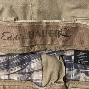 Eddie Bauer has designed these pants for cold weather, featuring a durable cotton exterior in a khaki color and a soft, plaid flannel lining for added warmth. Classic straight-leg fit suitable for casual or outdoor wear. 34 inch inseam.