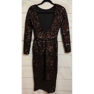 Dress the Population Emery Sequin Midi Dress Bronze Black Art Deco Long Sleeve S