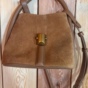 This warm, brown suede handbag feathers a cute metallic snap closure with synthetic trim, and removable crossbody strap. Her compact size is perfect for carrying the essentials.