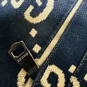Stylish Gucci jacket with iconic logo pattern. Features navy and white colors. Red stripe detail on shoulders. Perfect for a fashionable look.