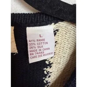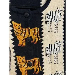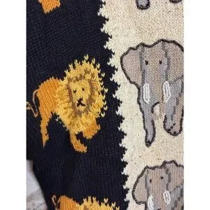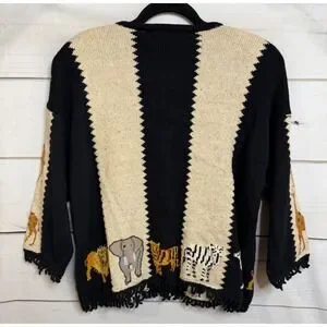 Vintage Jane's Closet cardigan sweater features a vibrant safari animal motif including lions, elephants, tigers, zebras, and giraffes. Crafted from a premium blend of ramie, cotton, and silk, this knit piece is elevated with intricate beadwork and sequins that add a subtle shimmer to the animal patterns. The design includes a button-front closure, a classic round neckline, and unique looped fringe trim along the hem and sleeve cuffs. Perfect for collectors of novelty knits or those seeking a bold, eclectic statement piece with a whimsical zoo or jungle theme.