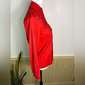 Stylish red blouse featuring elegant embroidery and button-up design. Perfect for any occasion.