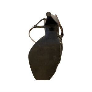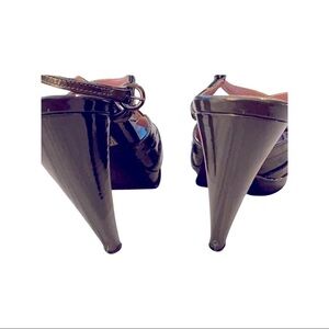 Worn once. Absolutely stunning high strappy heels in a dark green patent leather. Excellent condition
