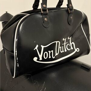 Sleek black duffel with bold white logo. Perfect for travel or gym. Durable handles and spacious interior. Can be used as a purse