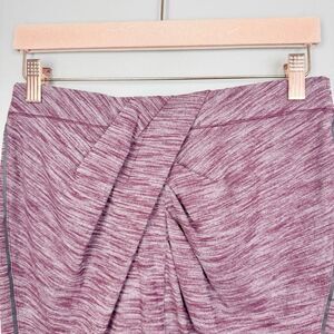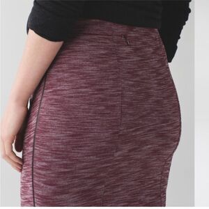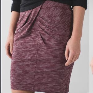 Nice stretchy skirt by Lululemon athletica. Wrap twist front style. Wine/maroon color with reflective black piping detail. Back zipper pocket. Sweat wicking. Four way stretch. Great condition! Women’s size 8.