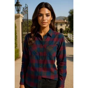 This Natural Reflections women’s button-up shirt features a rich plaid pattern in burgundy, deep blue, and olive green, crafted from 100% cotton for breathable comfort. Designed with dual chest pockets and a classic point collar, it’s perfect for layering or wearing solo through the seasons.