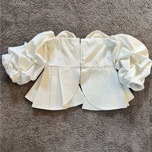 This elegant off-shoulder top features a chic design with puff sleeves, and ruffled layers perfect for any occasion. The crisp white color adds a touch of sophistication to your wardrobe.