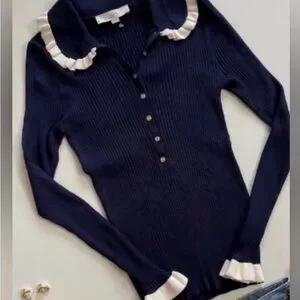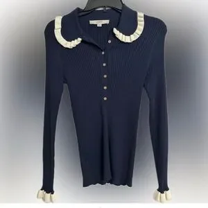 Chic navy button down with ribbed texture. Features cream ruffle accents on collar and cuffs. Ideal for a polished look or pair it with denim for more casual style!