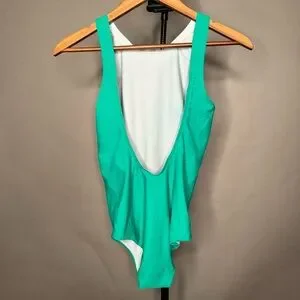 Great condition - worn only a few times. ADAY reversible white + beautiful vibrant green one piece swimsuit. Classic elegant cut with high neck low open back. Luxe feel.