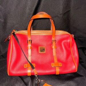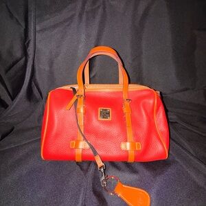 Bold red leather handbag with orange trim. Features dual handles and detachable strap. Ideal for daily use.