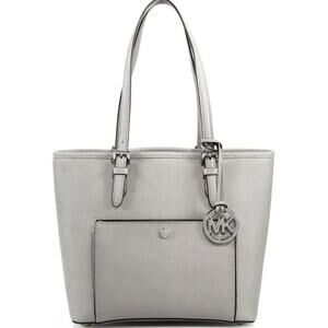 A chic and stylish tote bag by Michael Kors, perfect for everyday use. This versatile handbag features a sleek silver metallic finish, a convenient front pocket with a snap closure, and signature MK logo charm. The interior is lined with a monogrammed fabric and includes multiple pockets for organization. This Michael Kors tote combines fashion and function effortlessly, making it an ideal accessory for any outfit.