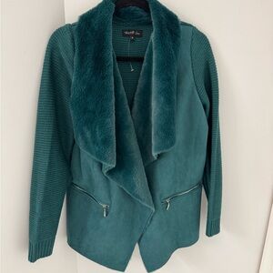 Twelfth Love Teal Knit Sleeve Moto Style Jacket Open Front with Faux Fur M NWT