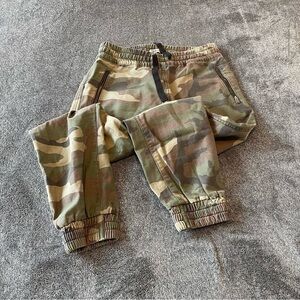 These are high-waisted joggers with an elastic waistband and zippered hand pockets. They're made with a structured, workwear-inspired twill.