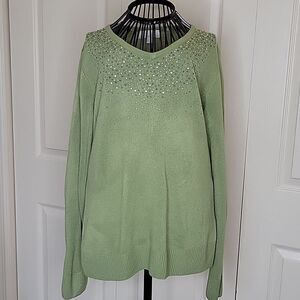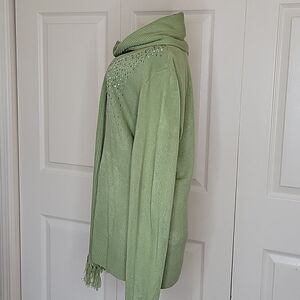 Carol Taylor green v-neck sweater embellished with stones and pearls. Comes with removeable scarf.