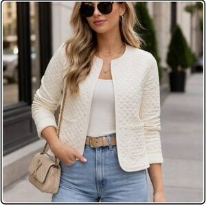 J.Crew Lightweight quilted jacket in a soft white ivory tone with a clean collarless design. Open front has hidden hook and eye closure and stylish pockets. Easy layering piece that works year-round, especially for spring and transitional weather. From office to vacation, this blazer makes a style statement.