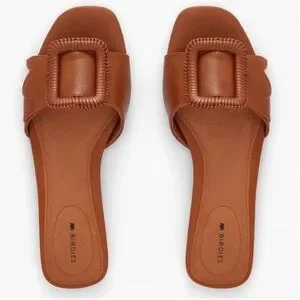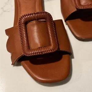 Elegant cognac slide sandals with a stylish buckle. Perfect for casual wear. Comfortable and chic design. Size 9.5. In excellent used condition! Comes with dust bag!