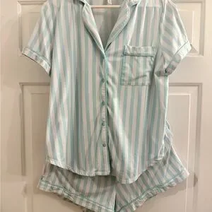Unwind in this chic aqua striped pajama set, featuring a button-up top and matching shorts. Ideal for a cozy night's rest. Excellent gently used condition