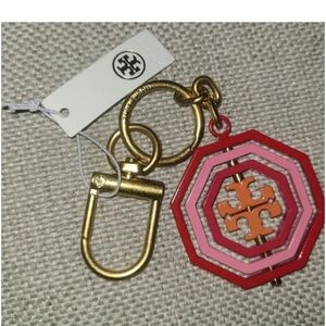 Chic Tory Burch key holder in vibrant red and gold. Perfect for adding a stylish touch to your keys.