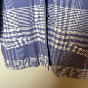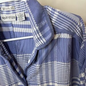 Apparenza top, patchwork plaid jacket, blue plaid shirt 1X, plus size button front top, cotton stretch jacket, casual layering top, women’s plus size plaid, lightweight jacket top
