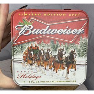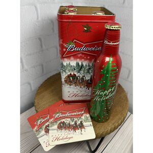 2007 Budweiser "Happy Holidays Limited Edition 2007" Collectible Tin, Empty Metal Bottles & Coasters - coasters have not been used, bottles are empty, but all have bottle caps - please see photos for condition of tin.