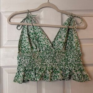 Embrace a fresh look with this floral green crop top. Perfect for casual outings, it features a charming design with adjustable straps for a personalized fit.