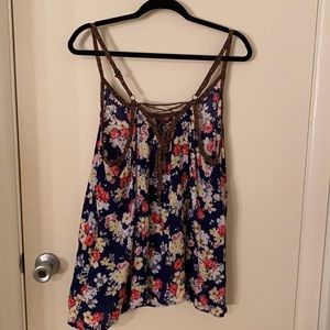 Floral cami top with lace-up detail. Features vibrant red and white flowers on a blue background. Spaghetti straps for a casual look.