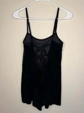 Urban Outfitters Black Velvet Mini Romper, Size M — Featuring a chic lace-up back design. This piece is crafted from soft, classic black velvet with thin adjustable shoulder straps and a flattering mini length. Perfect for festivals, parties, or a night out.