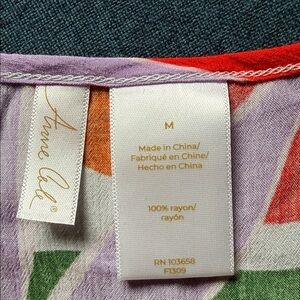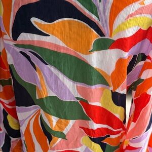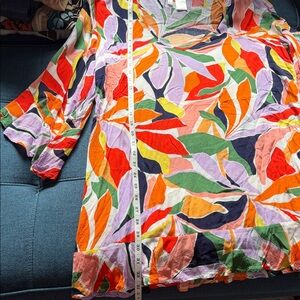 Anne Cole Eye-catching dress cover up with a vivid leaf design. Features a mix of red, pink, orange, green, and purple hues. V neck. Flowing sleeves Perfect for a bold statement. Lightweight perfect for summer wear. Smoke free, pet free home.
