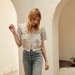 NWT Doen Sparrow Ramie Ruffle Collar Button Crop Top Meadowlark Plaid Blue
