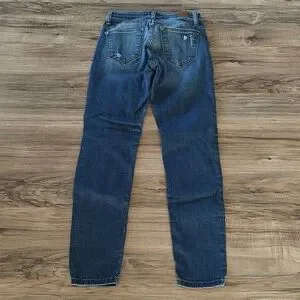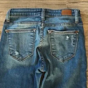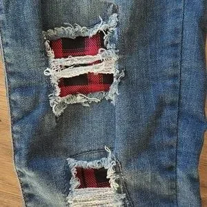 Excellent condition, no rips, stains, or holes that are not factory made. Distressed blue skinny jeans with red and black plaid patches behind the distressing - no actual skin will show. Super cute and stretchy and will still keep you warm due to the holes being covered. Size 3/26. Smoke free home.