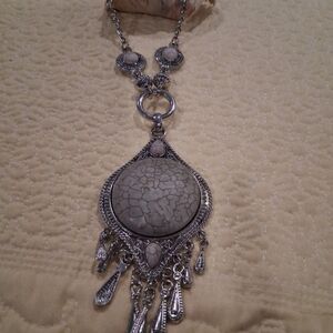 This elegant silver pendant necklace features intricate detailing and a stunning design. Perfect for adding a touch of sophistication to any outfit.