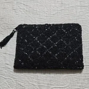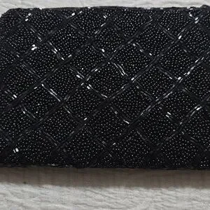 This elegant black beaded mini clutch is perfect for evening events. Its intricate design adds a touch of sophistication to any outfit.