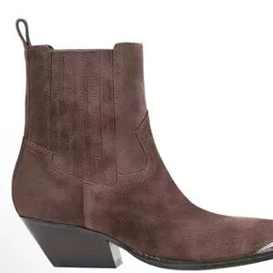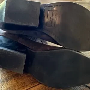 Very gently worn Marc Fisher dark brown suede western style booties with silver accent at toe. Size 8.5