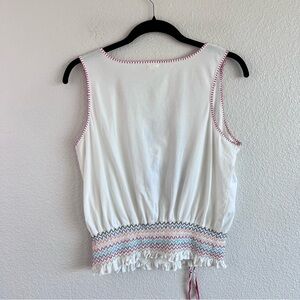 Tiny Anthropologie top, boho embroidered tank, floral peasant blouse, white bohemian top, smocked waist blouse, festival outfit top, summer boho style, embroidered sleeveless blouse, Anthropologie large top, cottagecore aesthetic