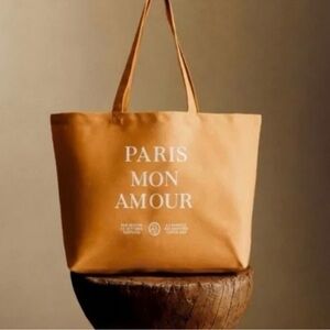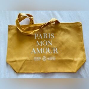 Chic Sezane tote in mustard canvas. Features bold white lettering. Perfect for daily essentials. New. Smoke Free Home.