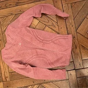 Cozy cowl neck sweater in a soft dusty rose. Features stylish perforated design. Ideal for layering.