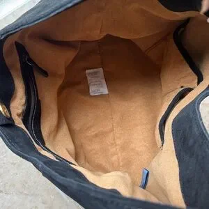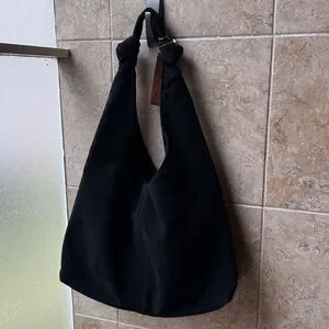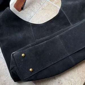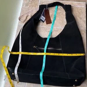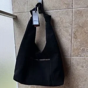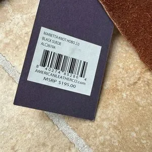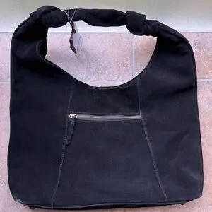 American Leather Company Marietta Knot Hobo 2.0 Bag Black Suede Leather NWT but PLEASE NOTE has a scuff on bottom corner (pictured). Brass tone feet on rectangular base, one outer & one inner zipper pocket, two inner slip pockets, roomy main compartment, cognac colored microfiber lining making it easy to find items inside! Fantastic bag! Dimensions in pictures, approximately 17 x 11 x 3.5 inches, with 11 inch strap drop.