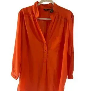 Gold Drama. Women's orange transparent blouse with three-quarter sleeves.Size1X.