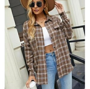 Button Down Flannel Plaid Shacket Long Sleeve Collared shirt Khaki