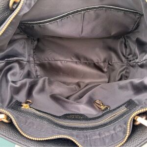 Elegant black pebbled leather tote by Pom Pom London. Ideal for everyday sophistication. Holds 15” laptop with ease. All original straps included plus matching leather and fabric strap.