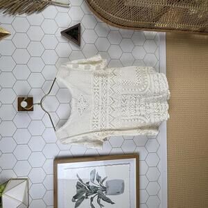 This charming crochet lace top features intricate geometric and floral patterns throughout, creating a delicate and feminine look. The short sleeves and scoop neckline add to its airy and comfortable feel, perfect for warm weather or layering. The cream color makes it versatile to pair with various bottoms for casual or dressy occasions.