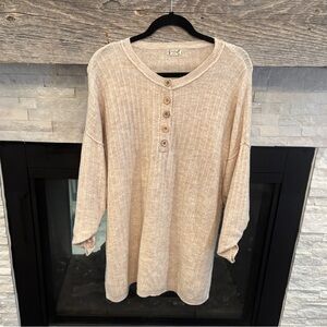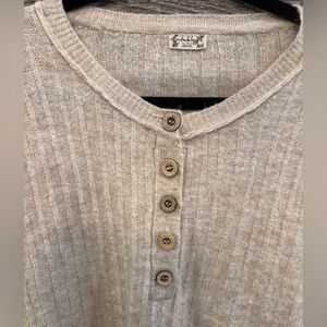72% acrylic, 25% nylon, 3% spandex. Hand wash cold. Partial front button closure. Pleated sleeve with button accent. Rib knit fabric with side hem slits. Oversize fit
