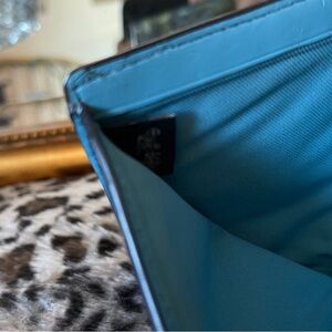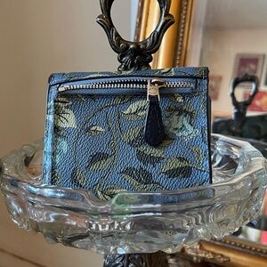 Chic Coach mini bag with a vibrant floral pattern. Features blue and green hues. Stylish and compact.