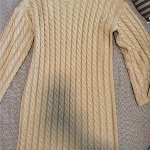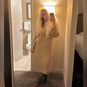 Stay warm and stylish with this cozy cable knit sweater dress. Perfect for any casual outing, this tan dress offers comfort and elegance. Worn twice