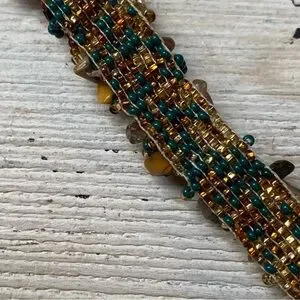 Handmade beaded gemstone bracelet featuring gold accents, teal seed beads and mixed stones for a boho, rustic-chic look. Close-up shot highlights texture, color contrast and artisan craftsmanship, perfect for fashion and gift use.