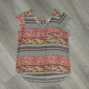 This vibrant women's top features a mix of colors and patterns, perfect for adding a pop of color to your wardrobe. Comfortable design! Peach like pink.