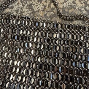 Elegant beaded design. Features black and silver tones. Perfect for evening outings.