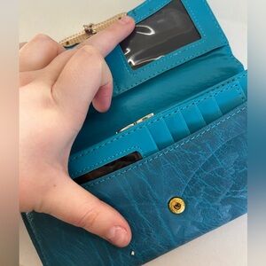 this stunning elegant teal wallet features vibrant embellishments, perfect for adding a touch of glamour & a pop of color to any outfit or occasion!