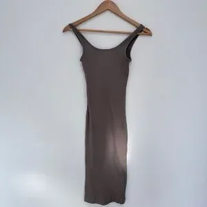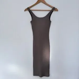 Stretchy, ribbed, tank midi dress. Keep it simple. This is a midi dress with a scoop neck. It's made with a stretchy ribbed knit.