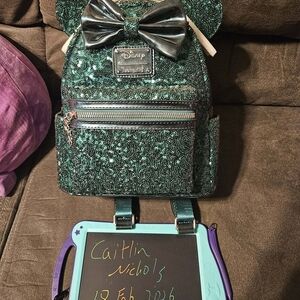Sparkling green sequin mini backpack with bow. Features Disney Loungefly logo.